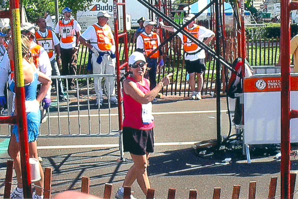 - Gretchen Triplett submitted this photo of her daughter, Liz (Triplett) Harken (AHS 1979), which shows Liz just after finishing the Medtronic Twin Cities Marathon on October 1, 2006